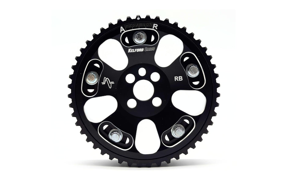 Kelford uses modern CNC machines for small batches, ensuring high quality and precise tolerances. Our gears are crafted from premium 6061 T6 aluminum, with beveled tooth edges for better belt life and hard anodized for durability. Laser-etched degree markings assist in engine tuning. High-quality fasteners and a heli-coil thread insert in the ring gear allow for secure tightening and multiple adjustments without thread wear.